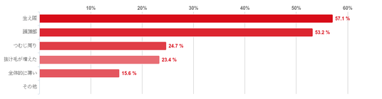 「生え際」と回答した人が57.1%で最も多く、次に「頭頂部」が53.2%でこの二つが過半数となった。そのほか、「つむじ周り」(24.7%)、「抜け毛が増えた」(23.4%)、「全体的に薄い」(15.6%)という順で並んだ。