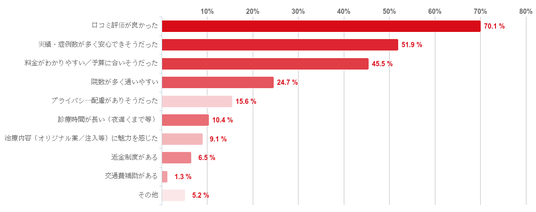 「口コミ評価が良かった」との回答が70.1%で最も多く、次に「実績・症例数が多く安心できそうだった」が51.9%、「料金がわかりやすい/予算に合いそうだった」が45.5%で続いた。そのほか、「院数が多く通いやすい」(24.7%)、「プライバシー配慮がありそうだった」(15.6%)などの回答も一定数集まった。