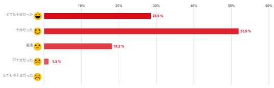 「十分だった」と回答した人が51.9%で過半数を占め最も多く、「とても十分だった」(28.6%)との回答と合わせて、回答者の8割が「リスクや副作用についての説明」について「十分だった」と感じていることがわかった。反対に、「不十分だった」と回答した人は僅かで「とても不十分だった」と回答した人はいなかった。