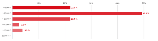 「~10,000円」(10,000円以内)と回答した人が49.4%で最も多く、次に「~5,000円」(5,000円以内)と「~20,000円」(20,000円以内)との回答が共に22.1%となり、回答者のほとんどは1ヶ月の費用が「20,000円以内」だということがわかった。また、「30,000円以上」費用がかかっている人は僅かしかみられなかった。