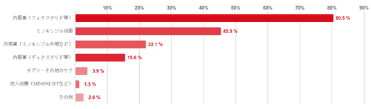 「内服薬(フィナステリド等)」と回答した人が80.5%で8割を超え最も多く、次いで「ミノキシジル内服」との回答が45.5%、「外用薬(ミノキシジル外用など)」が22.1%という順となった。また、「内服薬(デュタステリド等)」と回答した人は15.6%と少数で、その他の回答は僅かしかみられなかった。