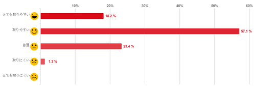 「取りやすい」と回答した人が57.1%と圧倒的に多く、次に「普通」が23.4%、「とても取りやすい」が18.2%という順となった。また、「取りにくい」と回答した人は1.3%と僅かとなり、「とても取りにくい」と回答した人はおらず、予約の取りやすさについて満足している人が多いことがわかった。