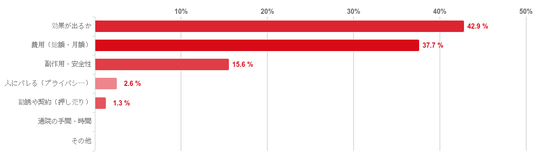 「効果が出るか」と回答した人が42.9%で最も多く、次に、「費用(総額・月額)」(37.7%)、「副作用・安全性」(15.6%)という順で並んだ。そのほか、「人にバレる(プライバシー)」や「勧誘や契約(押し売り)」と回答した人もいたが僅かで、「通院の手間・時間」と回答した人はいなかった。