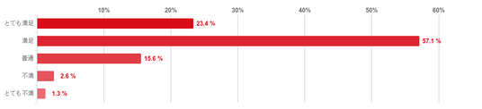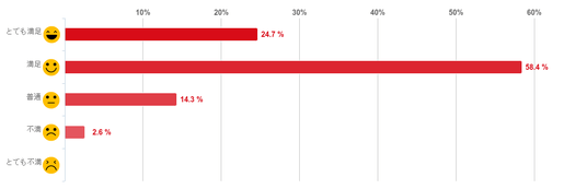 「満足」と回答した人が58.4%となり約6割で最も多く、「とても満足」(24.7%)との回答と合わせると8割以上の人がAGAスキンクリニックのAGA治療に満足していることがわかった。反対に、「不満」と回答した人は2.6%と僅かで「とても不満」と回答した人はいなかった。