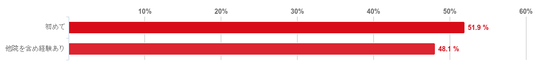 「初めて」と回答した人が51.9%で、「他院を含め経験あり」と回答した人が48.1%となり、初めてのAGA治療がAGAクリニックだったと回答した人が半数を超えることがわかった。