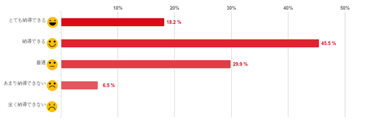 「納得できる」と回答した人が45.5%で最も多く、「とても納得できる」(18.2%)との回答と合わせて、回答者の7割以上が料金に対して「納得できる」と感じていることがわかった。反対に、「あまり納得できない」と回答した人は僅かで「全く納得できない」と回答した人はいなかった。