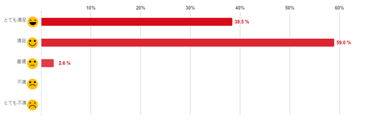 「満足」と回答した人が59.0%で約6割を占め最も多く、「とても満足」(38.5%)との回答と合わせて、回答者のほぼ全員が「院内の清潔感・雰囲気」について満足しており、評価が高いことがわかった。反対に、「不満」や「とても不満」と回答した人はひとりもいなかった。