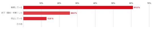 「継続している」と回答した人が61.0%と6割を超えて圧倒的に多かった。そのほか、「終了(解約・卒業)した」との回答が26.0%、「休止している」との回答が13.0%だった。