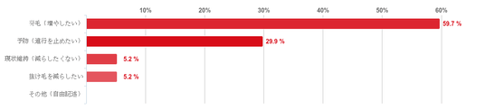 「発毛(増やしたい)」と回答した人が59.7%と約6割となり最も多かった。次に「予防(進行を止めたい)」との回答が29.9%と3割となり、これらの治療目的を一番重視していた人が回答者全体の9割にのぼることがわかった。