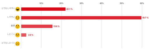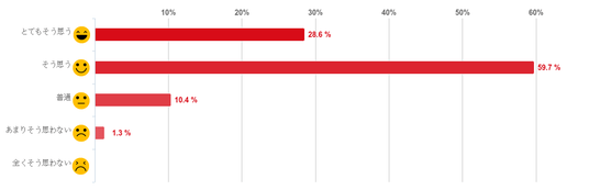 「そう思う」(わかりやすいと思う)と回答した人が59.7%で約6割となり最も多く、「とてもそう思う」(とてもわかりやすいと思う)との回答が28.6%で回答者の約9割が「医師やスタッフの説明のわかりやすさ」について満足していることがわかった。また、「あまりそう思わない」(あまりわかりやすいと思わない)との回答は1.3%と僅かで、「全くそう思わない」(わかりやすいと全く思わない)と回答した人はひとりもいなかった。