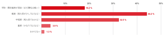 「軽度(見た目が少し気になる)」と回答した人が44.2%で最も多く、次いで「中程度(見た目でわかる)」との回答は32.5%となり、「軽度~中程度」で受診をした人が8割近くを占めていることがわかった。また、「予防・現状維持が目的(まだ薄毛は軽い)」と回答した人も18.2%で2割程度おり、「重度(かなり気になる)」との回答は僅かだった。