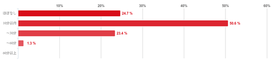 「10分以内」と回答した人が50.6%となり、半数を超え最も多く、「ほぼなし」と回答した人も24.7%となり、回答者の8割が待ち時間が長くても10分以内だと感じていることがわかった。また、「~30分」(30分以内)と回答した人は23.4%で、「~60分」(60分以内)と回答した人は1.3%と僅かだった。