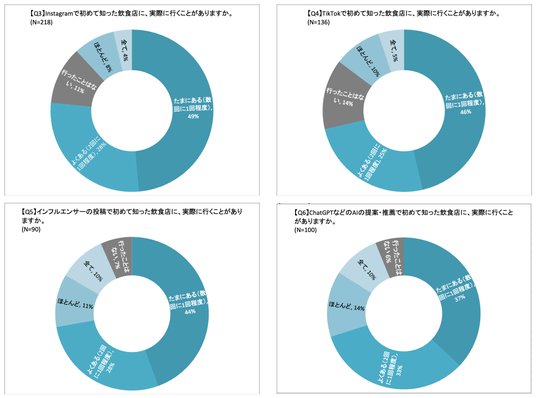 -Instagram、TikTok、インフルエンサーの投稿、ChatGPTなどのAI提案、による「飲食店の認知」が実際の来店に繋がっているかのアンケートでは、「ChatGPTなどのAI提案」が最も来店につながっている割合が多く、2回に1回は行っていると回答した割合は6割近くなっている(その他は50%未満)