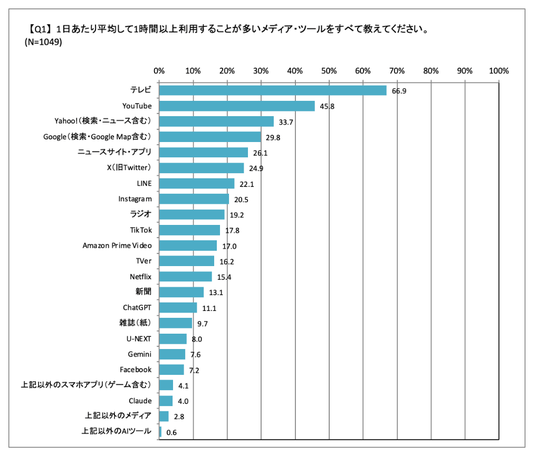 Q1. 1日あたり平均して1時間以上利用することが多いメディア・ツールをすべて教えてください。