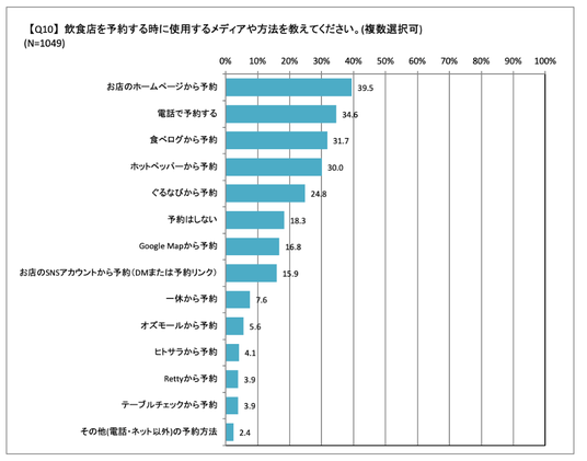 Q10. 飲食店を予約する時に使用するメディアや方法を教えてください。(複数選択可)