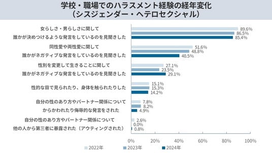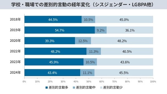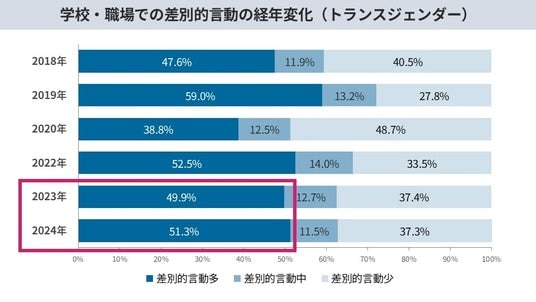 2)学校・職場でのトランスジェンダーへの否定的な言動が3年で10ポイント増。ハラスメントの防止も不十分。