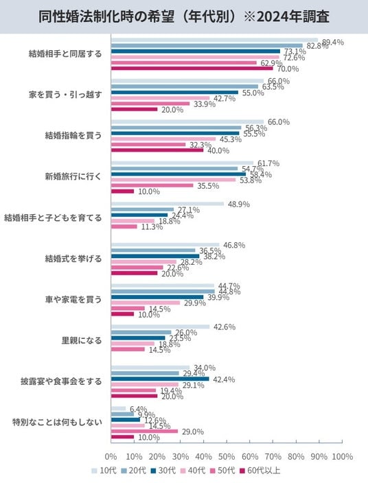 「もし自身が結婚できるとしたら、何をしたいか」という問いに対しては、「パートナーと同居する(77.4%)」が最多となり、次いで「家を買う・引っ越す(55.8%)」「新婚旅行に行く(54.0%)」といった回答が多い結果になりました。法制化は、当事者の精神的な充足のみならず、家電を買う(38.8%)、結婚式を挙げる(35.2%)といった幅広い分野で好影響があることがわかります。なお、これらの意欲は年代やSOGIによっても多様な傾向が見られました。