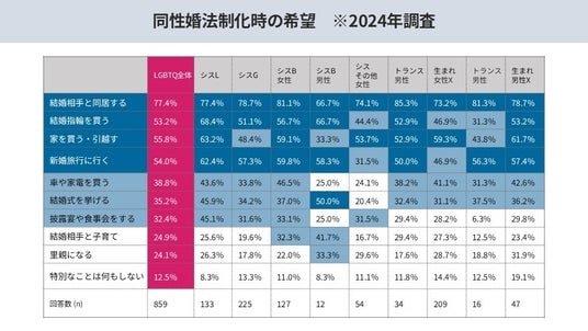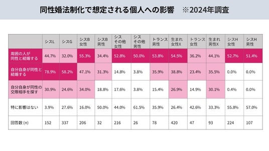 ・同性婚が実現した場合、「同性と結婚する(43.0%)」「同性の交際相手を探す(25.2%)」といった回答が上位に並び、法制化が当事者の生活に大きな影響をもたらすことが明らかに。