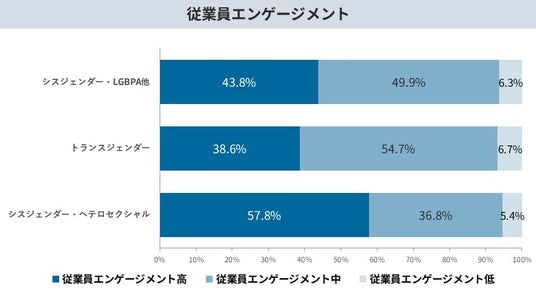 従業員エンゲージメントにおいては、当事者層は非当事者層と比較して低い水準に留まっていることが判明しました。「エンゲージメントが高い」と回答した割合は、シスジェンダーかつヘテロセクシュアル(非当事者)層の57.8%に対し、シスジェンダーのLGB他層で43.8%、トランスジェンダー層では38.6%にまで低下しています。今回の調査における非当事者層には大手企業の人事・ダイバーシティ担当者が一定数含まれており、一般統計との比較には留意が必要ですが、LGBTQ当事者層は、年齢や職位が低い傾向にあるほか、非正規雇用などの不安定な雇用形態にある割合が高いことが影響している可能性があります。