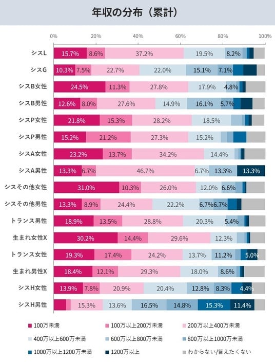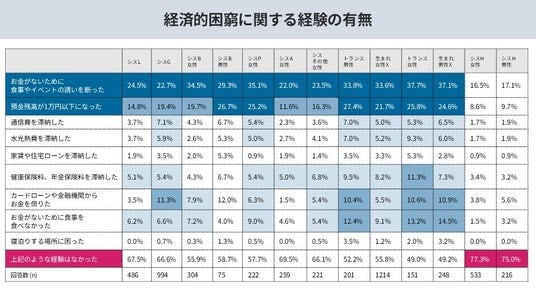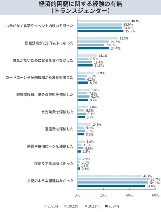 ・トランス女性の約4割弱が年収200万円未満であり、トランスジェンダーの約12%が「お金がなく食事を抜いた経験がある」と回答。非正規雇用や単身世帯が多いこともあり、物価高などの社会不安の影響を直接的に受けていることが明らかに。