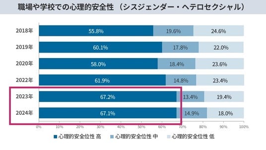 当事者層における心理的安全性は、2018年から2022年にかけて低下傾向にありましたが、2023年からは回復の兆しを見せています。また、2024年時点で心理的安全性が高いと回答した当事者は53.2%と過去最高を記録したものの、非当事者層の67.1%と比較すると、心理的安全性の確保には課題が残っていることがわかります。さらに、社会的な逆風や理解不足が職場環境においても当事者を追い詰める要因となっている懸念があります。また前述の結果にある通り、2022年にかけて職場でのLGBTQ施策は増加していますが、反比例するように当事者の心理的安全性が低迷していることが明らかになりました。これは、職場でLGBTQ施策が話題に上る機会が増えたことで、周囲に公表していない当事者の不安を煽ったり、アウティングのリスクが高まった可能性が推察されます。