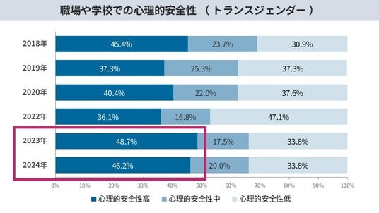 4)LGBTQの53.2%が心理的安全性が高いと回答し過去最高。一方で、トランスジェンダーは低下傾向。