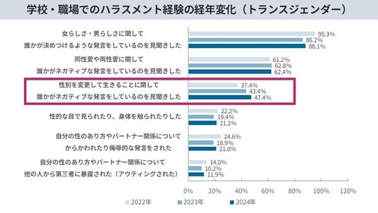 ・学校や職場で「性別変更に関するネガティブな発言」を見聞きしたトランスジェンダー当事者は、2022年の37.4%から2024年には47.4%と、3年で10ポイント増。