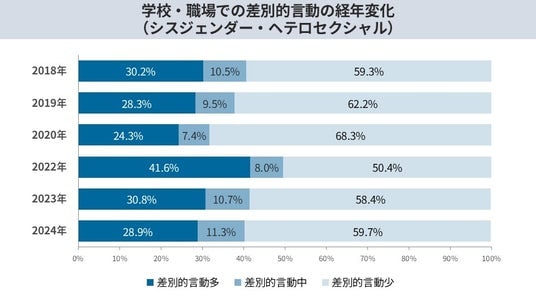 学校や職場での性的マイノリティを取り巻く差別的言動の発生状況について、2018年から2020年にかけては減少傾向にありましたが、2022年から2024年においては、シスジェンダーかつヘテロセクシュアル(以下、非当事者層)を除き、改善が見られないことが明らかになりました。LGBTQ当事者と非当事者の比較においては、当事者層が「差別的言動が多い」と回答する割合が一貫して高い状況が続いています。特にトランスジェンダーにおいては、差別的言動が多いという状況に改善が見られません。この背景には、近年のSNS上における排他的な言説の広がりが学校や職場といった現実社会へも影響を及ぼしている可能性が示唆されます。