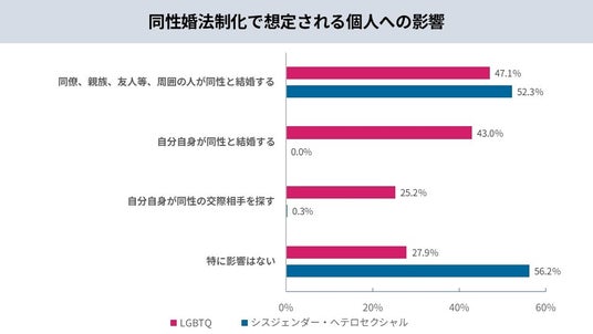 同性婚に関する裁判が進行する中、同性婚が実現した際の希望を調査しました。LGBTQ当事者層では「自分自身が同性と結婚する(43.0%)」「同性の交際相手を探す(25.2%)」といった回答が上位に並び、法制化が当事者の人生設計やライフスタイルに大きな影響をもたらすことがわかります。一方で、非当事者層では、法制化したとしても「特に影響がない(56.2%)」という回答が過半数を占めました。「周囲の人が同性と結婚する(52.3%)」という認識はあるものの、法制化を自身の生活において具体的にイメージすることの難しさが伺えます。