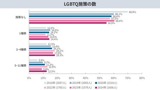 職場のLGBTQ施策の実施状況について、2018年からの経年変化をみると、施策が全く行われていない職場は69.9%(2018年)から54.9%(2024年)へと15ポイント改善しており、何らかの取り組みを始める職場は着実に増加しています。しかし、「特に何の対応もない」という回答が直近3年間連続して過半数を超えており、依然として半数以上の職場においてLGBTQ施策が手付かずの状態にあることが明らかになりました。