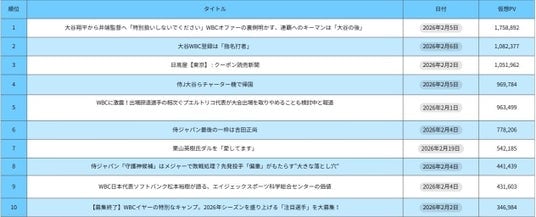 「WORLD BASEBALL CLASSIC 2026」ウェブニュースランキング