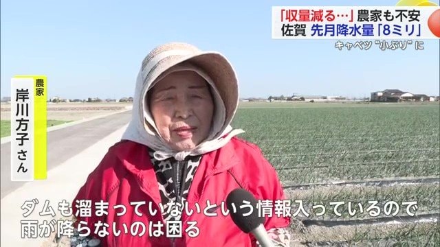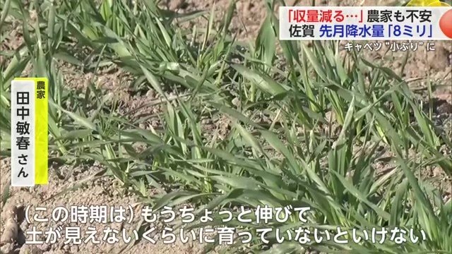 少雨による水不足は農家にも影響を与えている。佐賀市では1カ月間の降水量がわずか8ミリ。このため農作物の生育が遅れていて収量が大きく減少する可能性があり、農家は不安を募らせている。