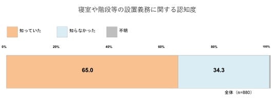 住警器について、寝室や階段等への設置義務を「知っていた」と答えた人は65.0%にのぼり、設置に関する認識は一定程度浸透していることが示された。一方で、「設置後10年を目安に交換する」という推奨については、71.1%が「知らなかった」と回答している。