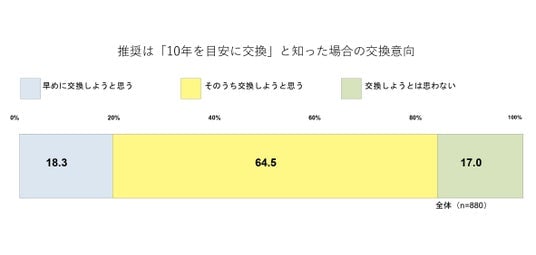 「設置後10年を目安に交換すること」が推奨されていることを知った後、すぐに交換しようと思うかという設問に対して、「早めに交換しようと思う」との回答は18.3%にとどまった。