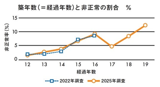 住警器は、設置からの年数が経過するほど、「電池切れ」「故障」「鳴動しない」といった非正常状態の割合が高まる傾向にあることが確認された。経過年数別にみると、2025年調査では、非正常状態の割合が19年経過で12.4%となり、2022年調査時の16年経過で8.7%という結果と比較して増加していることが確認された。