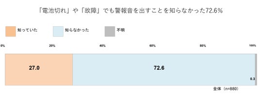住警器は、火災時だけでなく、電池切れや故障といった異常が起きた場合にも警報音で知らせる仕組みになっている。しかし、「火災以外でも警報音が鳴ること」を知らなかった人が72.6%にのぼり、警報音の意味が十分に理解されていない実態が明らかになった。警報音が鳴った際に、その意味を正しく理解できなければ、電池切れや故障といった異常が見過ごされ、必要な対応が取られないまま使用が続けられると、火災発生時に警報器が作動しないリスクにつながるおそれがある。