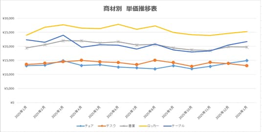 2026年1月度 商材別 単価推移表 例年通り、年末の駆け込み需要後はオフィスの動きが一旦落ち着いた