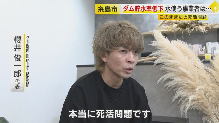 糸島市の美容院『フーカヘアショップ』。2月2日から『減圧給水』が続いているが、櫻井俊一郎代表に尋ねると「若干、いつもは、もうちょっと勢いよくジャーって出ているような感じはするんですけど」。水の勢いが弱いという。