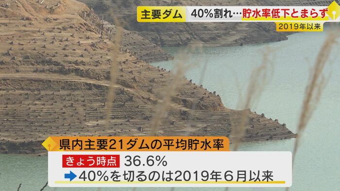 県内の主要21ダムの平均貯水率は、2026年2月24日時点で36.6%となっていて、40%を切るのは、2019年6月以来だということだ。
