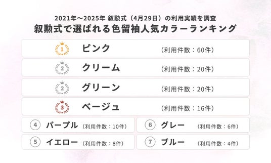 叙勲式利用144件を分析。最も選ばれたのはピンク、次いでクリーム・グリーン。