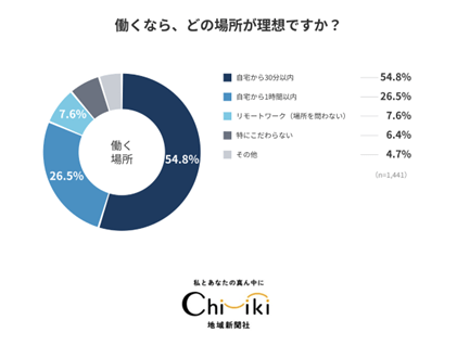 「働くなら、どの場所が理想ですか?」という質問に対し、「自宅から30分以内」が54.8%で最多、「自宅から1時間以内」が26.5%となり、合計81.3%が地元志向という結果になりました。リモートワークを希望する人は7.6%にとどまりました。