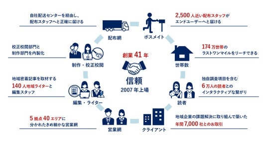当社は、地域密着型の生活情報誌『ちいき新聞』の発行を軸に、情報発信および販売促進の総合支援事業を展開しており、年間約7,000社にサービスを提供しています。千葉県を中心に毎週発行している『ちいき新聞』は、専属の配布員により174万世帯へポスティングされ、創業以来40年以上にわたり配布を継続してきたことで、他に類を見ない9つのアセットを築いてきました。