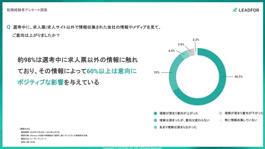 選考中に求人票以外の情報に触れた候補者は97.7%。そのうち66.5%が「理解が深まり意向が上がった」と回答しました。候補者は選考中に企業を見極めており、その判断材料となる情報を企業側がどれだけ設計できるかが、意思決定を左右していることを示すデータです。