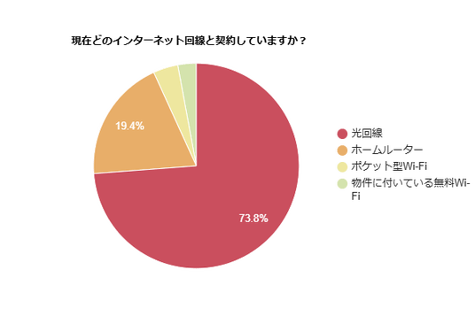 現在契約しているインターネット回線について調査を行ったところ、「光回線」が73.8%で最も多く、次いで「ホームルーター」が19.4%でした。一方で、モバイル回線(ポケット型Wi-Fi)や物件に備わっている無料Wi-Fiは少数派であることが示されています。