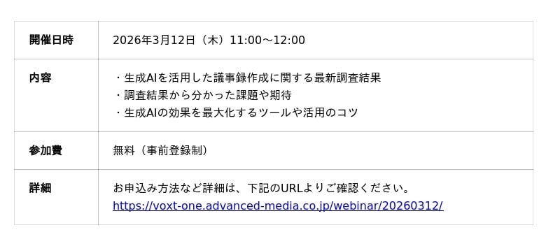 本調査結果をもとに、議事録作成における生成AI活用の実態を共有するウェビナーを3月12日(木)に開催します。ディスカッション形式で議事録作成の現在地とこれからの姿を多角的に探るほか、実務で役立つ「議事録作成で生成AIを効果的に活用するポイント」も分かりやすくお伝えします。