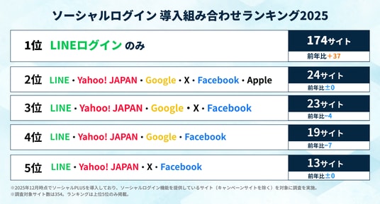ソーシャルログインの導入組み合わせランキングでは、前年に引き続き「LINEログインのみ」を導入するサイトが1位となりました。
