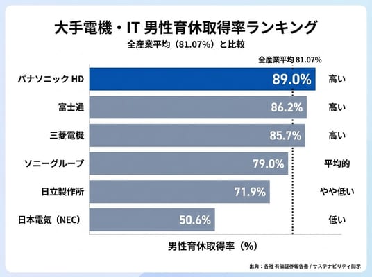 男性育休の取得率は、制度があるだけではなく、現場で取得しやすい雰囲気・業務設計が伴っているかを示す参考指標になります。電機・IT主要6社の比較は以下の通りです。