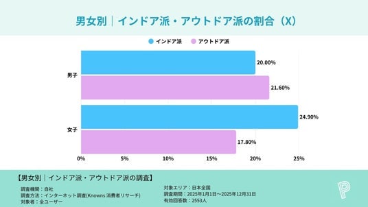女性はインドア寄り、男性はアウトドア優勢…傾向がハッキリ