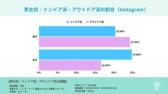 男女別に比較すると、アプリごとに“インドア/アウトドア”の偏りが異なり、ギャップの大きさにも差が見られました。例えばInstagramでは男性アウトドア派が24.3%に対し、女性アウトドア派は16.6%と開きがありました。