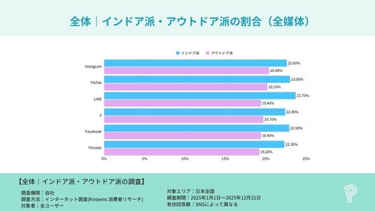 ・全体傾向:主要SNS6アプリすべてで「インドア派」が「アウトドア派」を上回る結果に。なかでも LINEはインドア派23.7%・アウトドア派19.4% と差が大きく、最も“インドア寄り”の傾向が見られた。